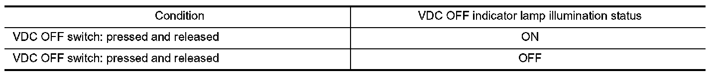 VDC OFF indicator lamp in the combination meter turns ON/OFF correctly.
