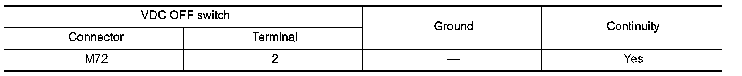 Check continuity between VDC OFF switch connector M72 terminal 2 and ground.