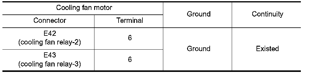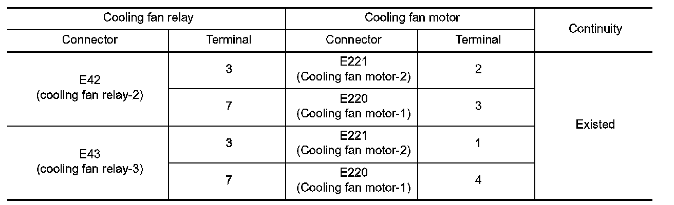 3.Check the continuity between cooling fan relay-2, -3 terminals under the following conditions.