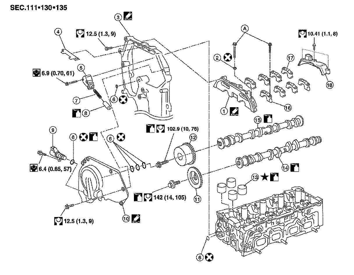 9.Loosen the camshaft bracket bolts in the order as shown, and remove the camshaft brackets and camshafts.