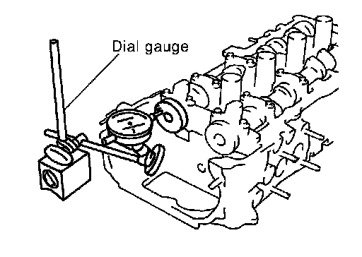 1.Install a dial gauge in the thrust direction on the front end of the camshaft. Measure the end play with the dial gauge while moving the camshaft forward and backward (in direction to axis).