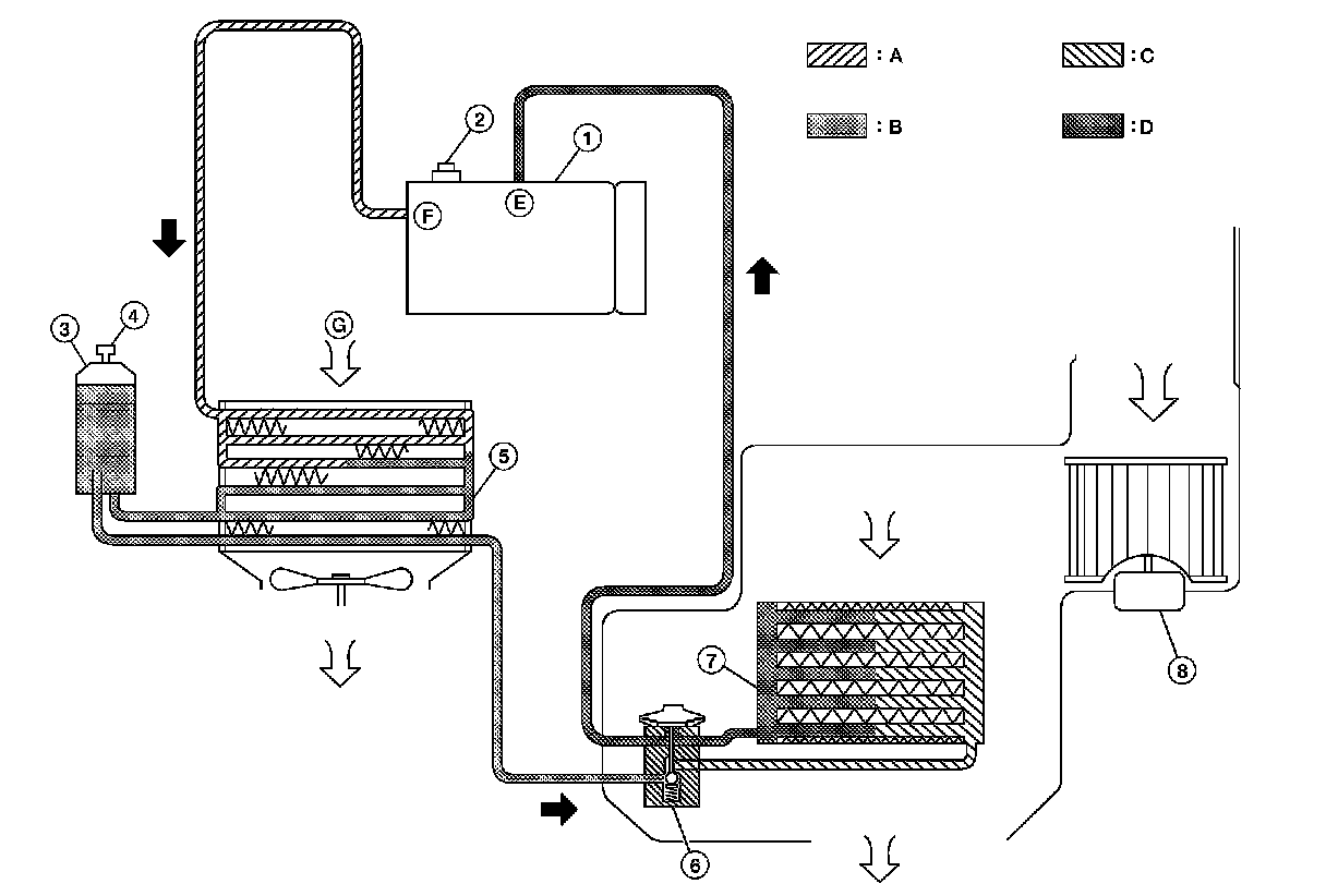 The refrigerant flows in the standard pattern, that is, through the compressor, the condenser with liquid tank, through the evaporator, and back to the compressor. The refrigerant evaporation through the evaporator coil is controlled by an externally equalized expansion valve, located inside the evaporator case.