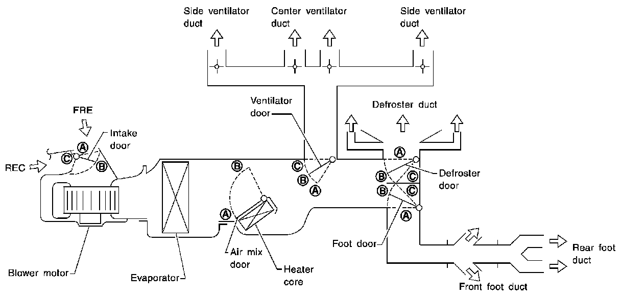 - Data sent from the front air control are selected according to data-based decisions made by the mode door motor, air mix door motors and intake door motor.