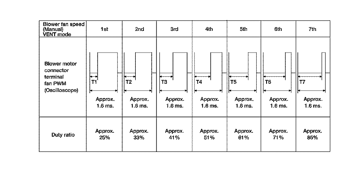 4.Check the output waveform between blower motor harness connector M31 terminal 3 and ground using an oscilloscope, while varying the fan speed from 1 to 7.