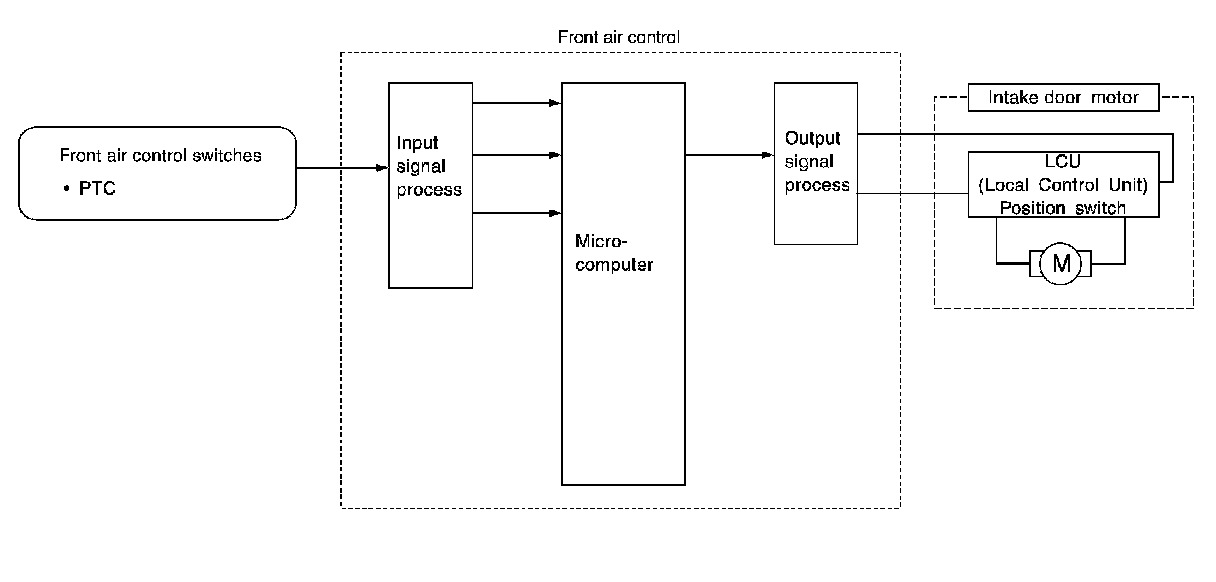 When the recirculation switch is depressed the intake door motor rotates closing off the fresh air inlet and recirculating the cabin air. If the recirculation switch is depressed again, the intake door motor rotates in the opposite direction, again allowing fresh air into the cabin.