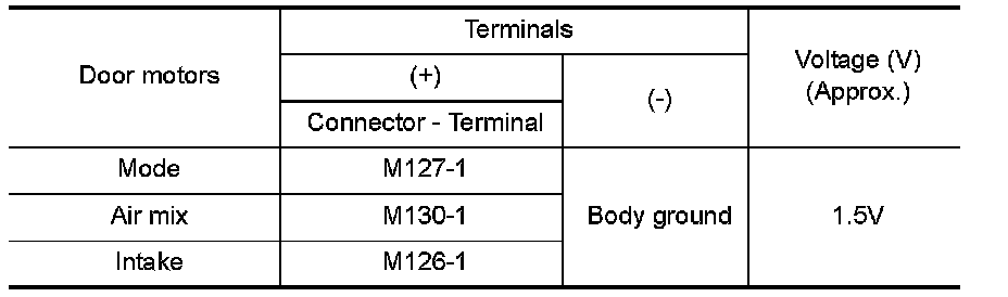 4.Check voltage between mode door motor connector M127 terminal 3 and ground, between air mix door motor connector M130 terminal 3 and ground, and between intake door motor connector M126 terminal 3 and ground.