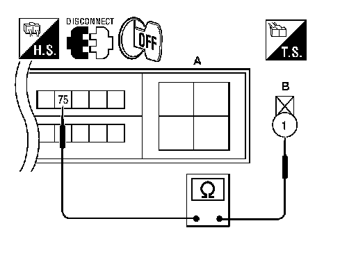 3.Check continuity between IPDM E/R harness connector F10 (A) terminal 75 and oil pressure switch harness connector F41 (B) terminal 1.