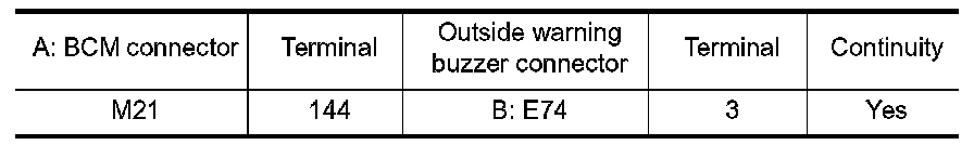 2.Check continuity between BCM connector and outside warning buzzer connector.