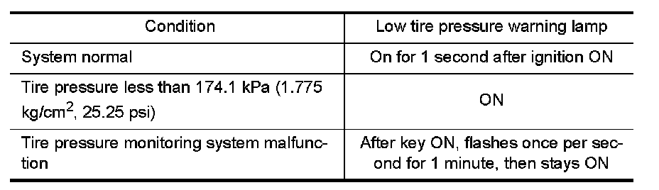 When the tire pressure monitoring system detects low inflation pressure or an internal malfunction, the low tire pressure warning lamp in the combination meter comes on. The malfunction is indicated by the low tire pressure warning lamp flashing.