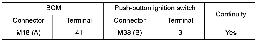 3.Check continuity between BCM connector M18 (A) terminal 41 and push-button ignition switch connector M38 (B) terminal 3.