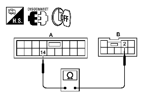 2.Check continuity between BCM connector M17 (A) terminal 14 and push-button ignition switch connector M38 (B) terminal 2.