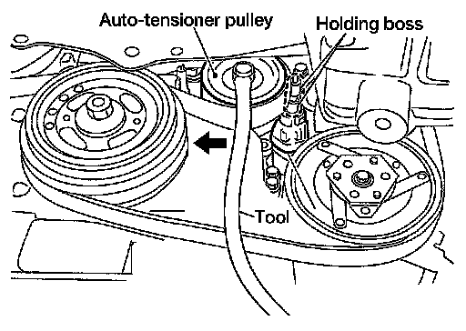 - Do not loosen the auto-tensioner pulley bolt. (Do not turn it counterclockwise.) If turned counterclockwise, the complete auto-tensioner must be replaced as a unit, including pulley.