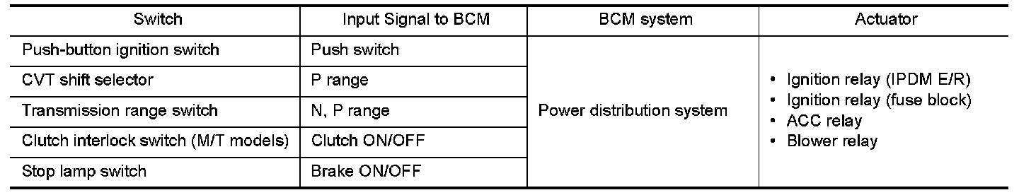 - When starting the engine, the BCM monitors under the engine start conditions, - Brake pedal operating condition (CVT models)