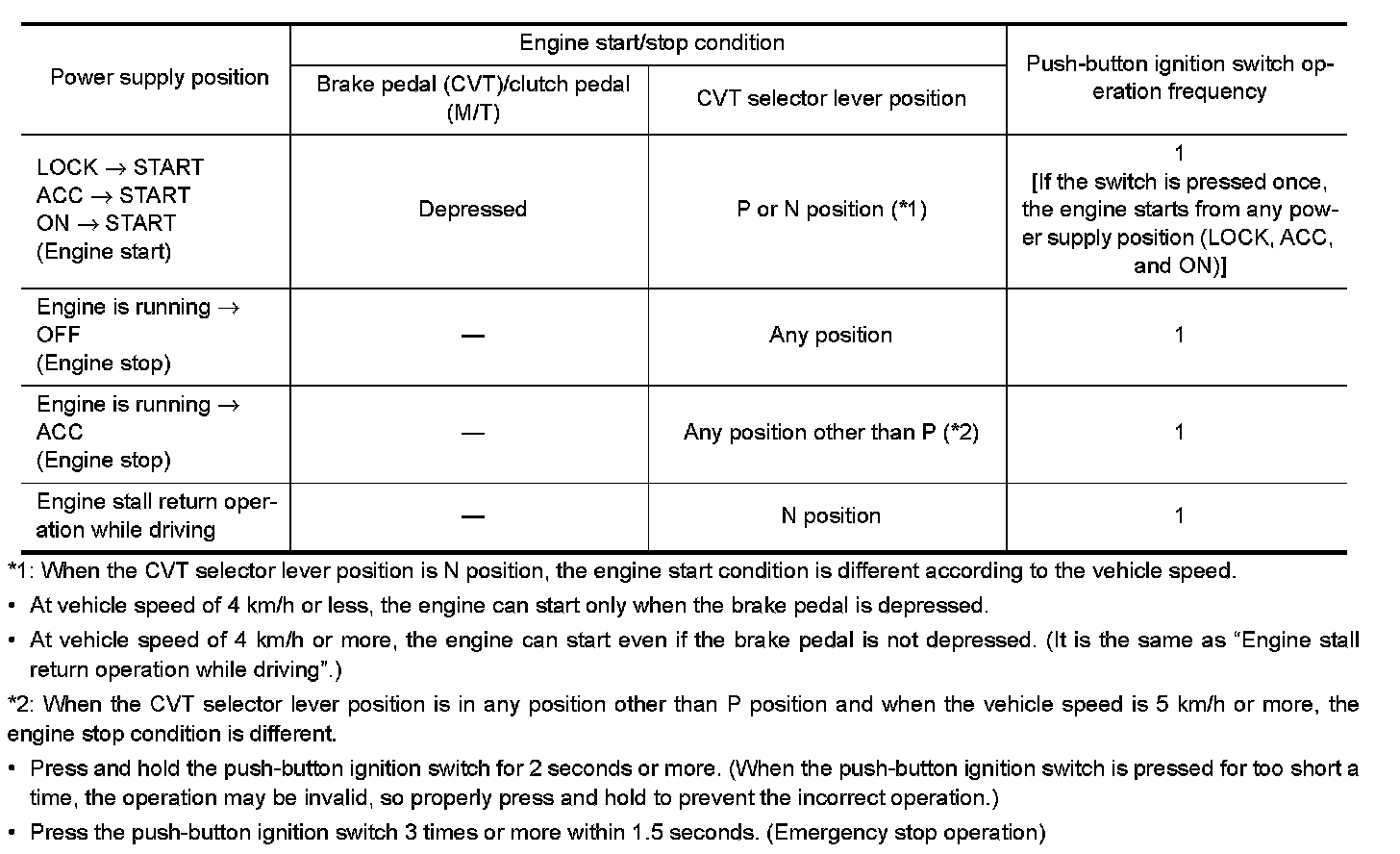 The engine switch operation changes due to the conditions of brake pedal, CVT selector lever and vehicle speed.