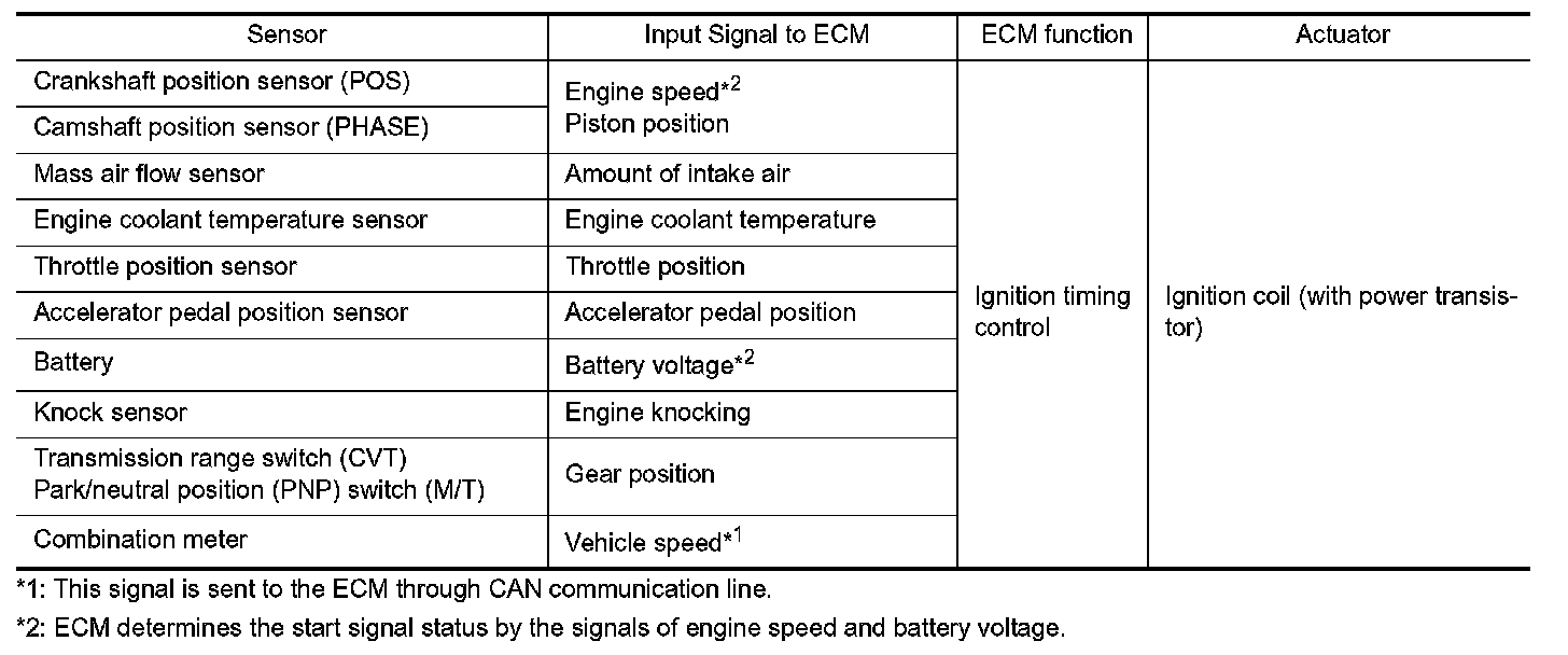 The ECM receives information such as the injection pulse width and camshaft position sensor (PHASE) signal. Computing this information, ignition signals are transmitted to the power transistor.