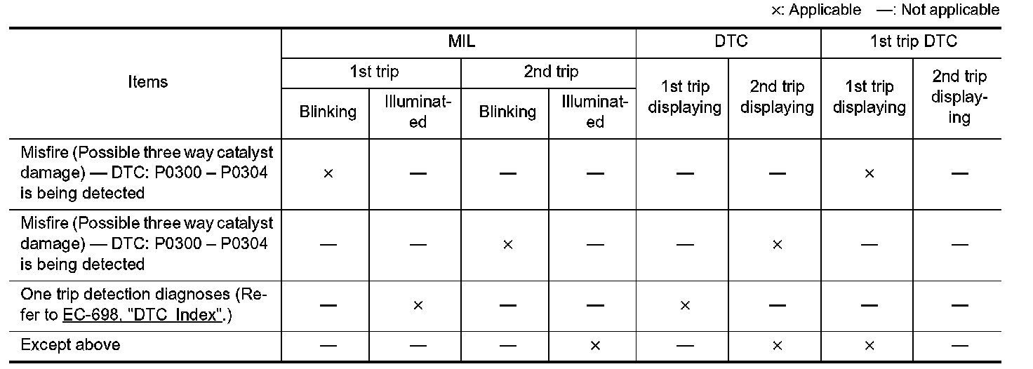 <2nd trip> The "trip" in the "Two Trip Detection Logic" means a driving mode in which self-diagnosis is performed during vehicle operation. Specific on board diagnostic items will cause the ECM to illuminate or blink the MIL, and store DTC and Freeze Frame data, even in the 1st trip, as shown below.