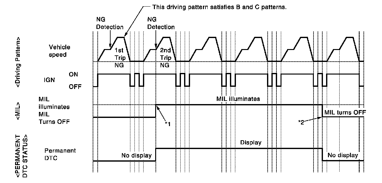 When a DTC is stored in ECM and MIL is ON, a permanent DTC is erased with MIL shutoff if the same malfunction is not detected after performing the driving pattern for MIL shutoff three times in a raw.