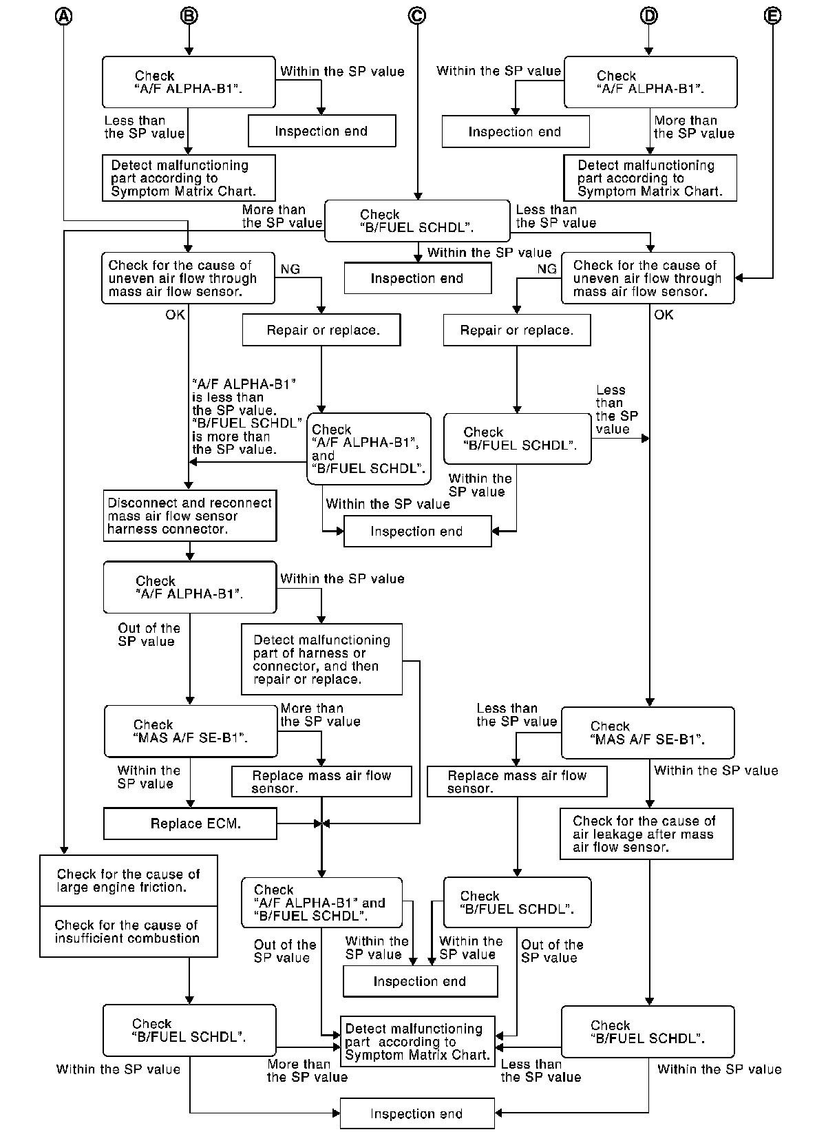 Select "A/F ALPHA-B1" and "B/FUEL SCHDL" in "SPEC" of "DATA MONITOR" mode, and make sure that the indication is within the SP value.