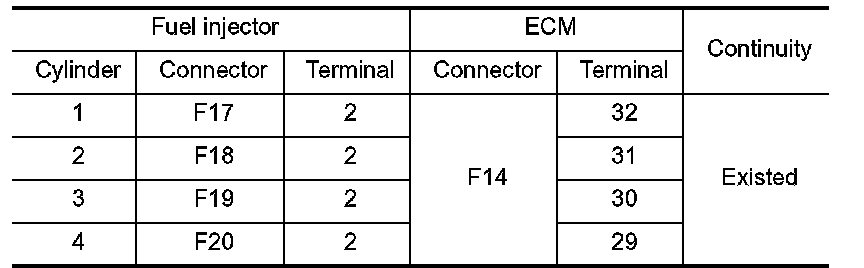 3.Check the continuity between fuel injector harness connector and ECM harness connector.