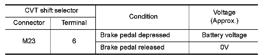 3.Check voltage between CVT shift selector connector M23 terminal 6 and ground.