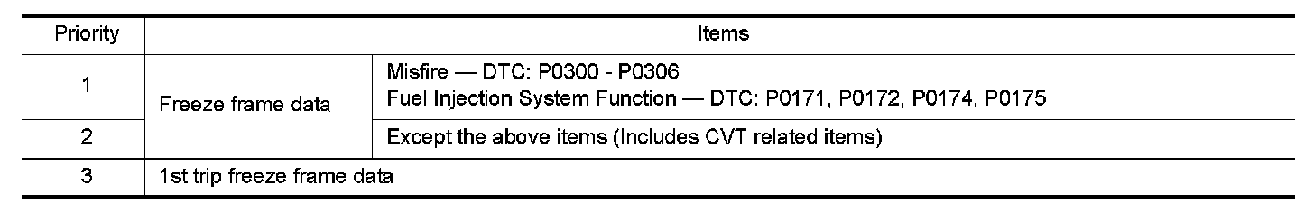 Only one set of freeze frame data (either 1st trip freeze frame data or freeze frame data) can be stored in the ECM. 1st trip freeze frame data is stored in the ECM memory along with the 1st trip DTC. There is no priority for 1st trip freeze frame data, and it is updated each time a different 1st trip DTC is detected. However, once freeze frame data (2nd trip detection/MIL on) is stored in the ECM memory, 1st trip freeze frame data is no longer stored. Remember, only one set of freeze frame data can be stored in the ECM. The ECM has the following priorities to update the data.