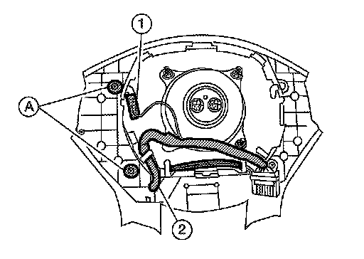 Make sure the steering switch harness is correctly routed below the center of the driver air bag module inflator (1) as shown (B), and NOT incorrectly routed across the driver air bag module inflator as shown (A).