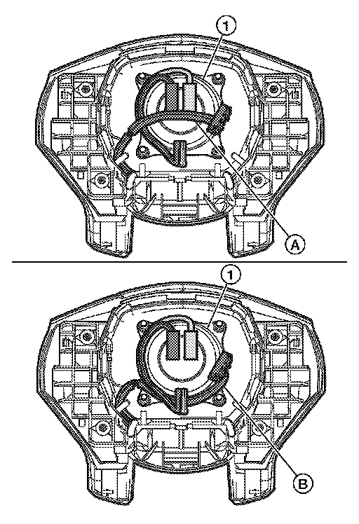 - Make sure that the steering switch harness is routed below the center of the air bag module inflator (1) as shown (B), and is not routed so it is pinched between the driver air bag module inflator (1) and steering column shaft threads as shown (A).