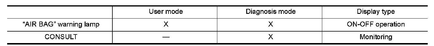 The mode applications for the "AIR BAG" warning lamp and CONSULT are as follows: