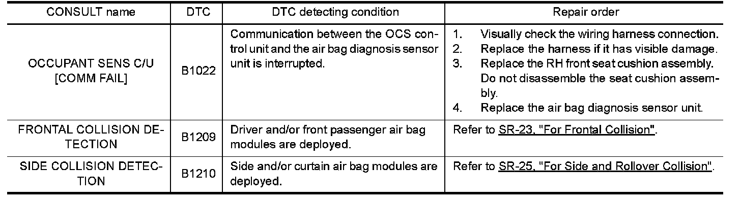 Follow the procedures in numerical order when repairing malfunctioning parts. Confirm whether malfunction is eliminated using air bag warning lamp or CONSULT each time repair is finished. If malfunction is still observed, proceed to the next step. When malfunction is eliminated, further repair work is not required.