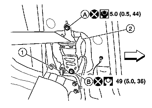 7.Remove seat belt retractor screw (A) and retractor anchor bolt (B), then remove seat belt retractor (2) from center pillar.