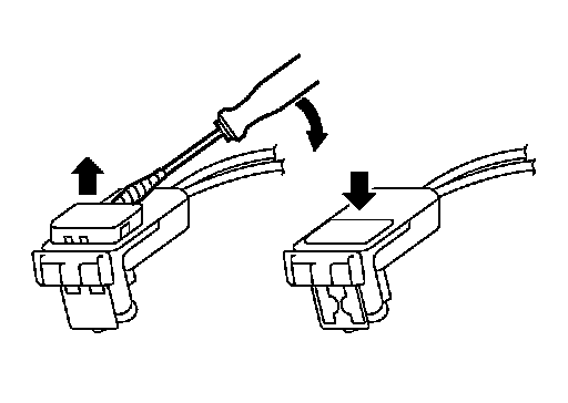 - For installing/removing seat belt pre-tensioner connector, insert a thin screwdriver wrapped with tape into the notch; lift locking tab then remove connector.