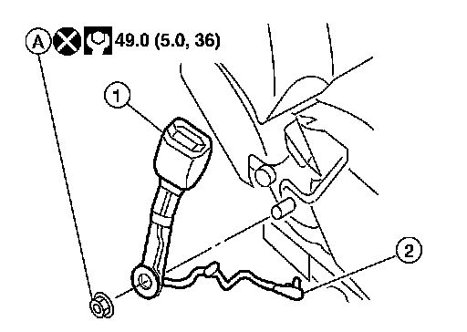 3.Remove anchor nut (A) from the seat belt buckle (1).