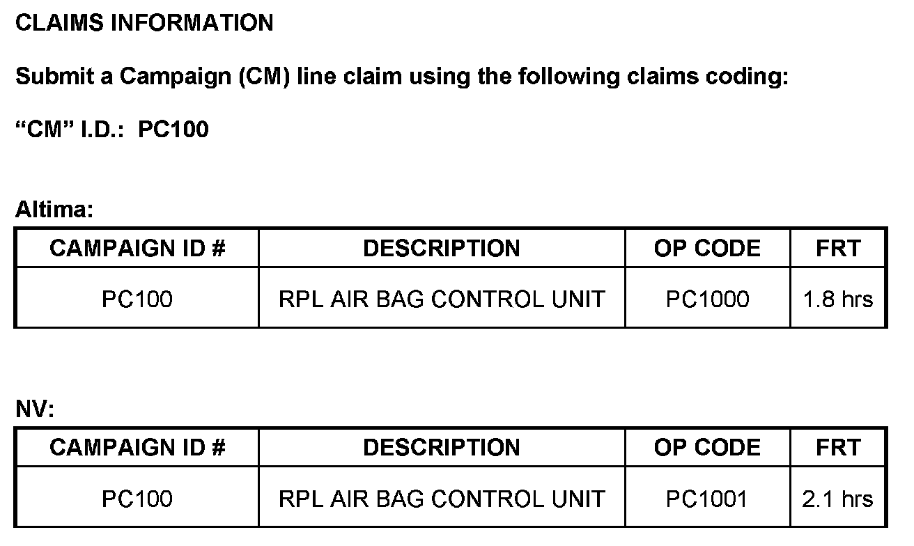 Nissan has assigned identification number PC100 to this campaign. This number must appear on all communications and documentation of any nature dealing with this Campaign.