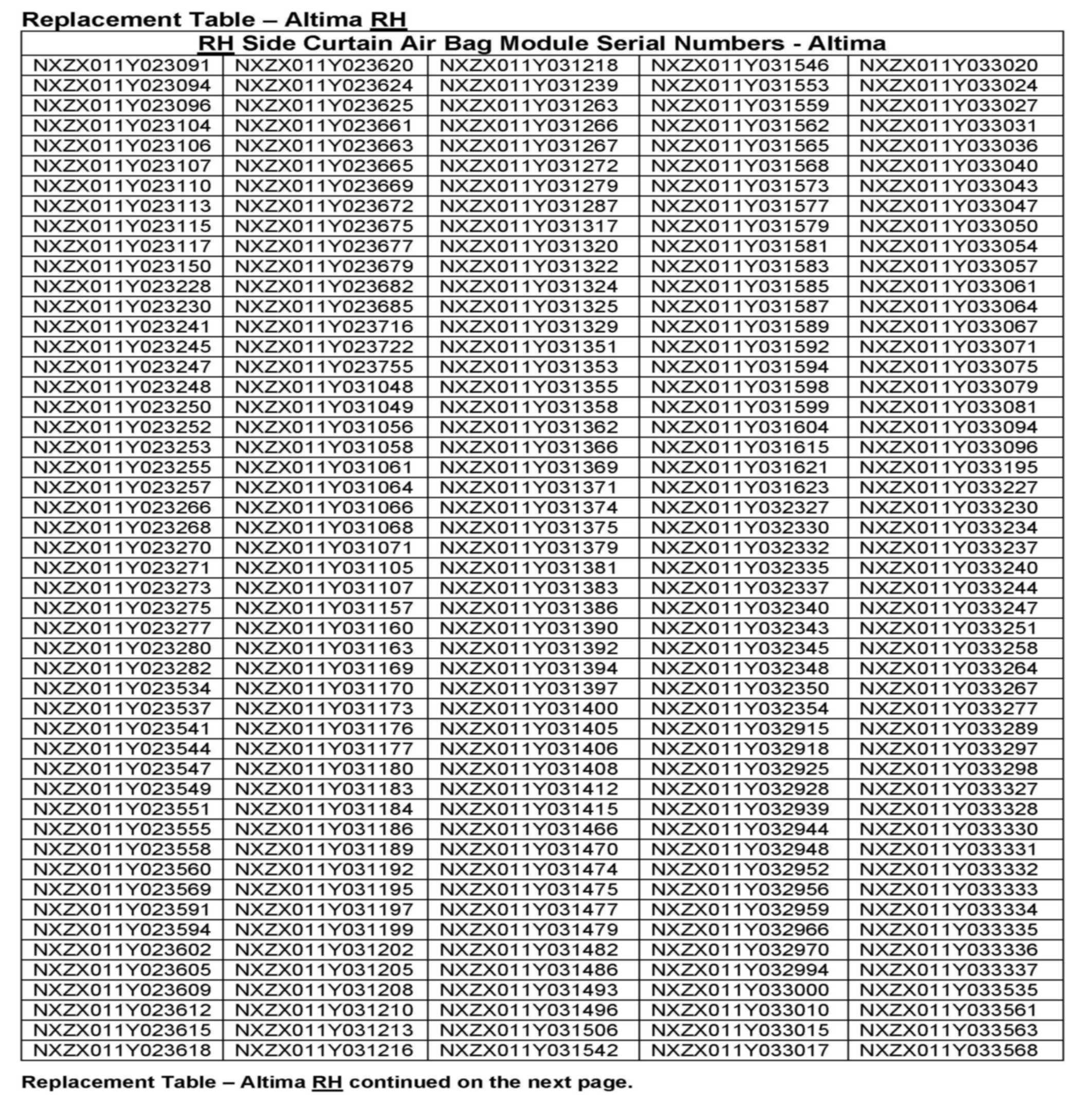 Replace only side curtain air bag modules that have a serial # that matches one in the Replacement Table.