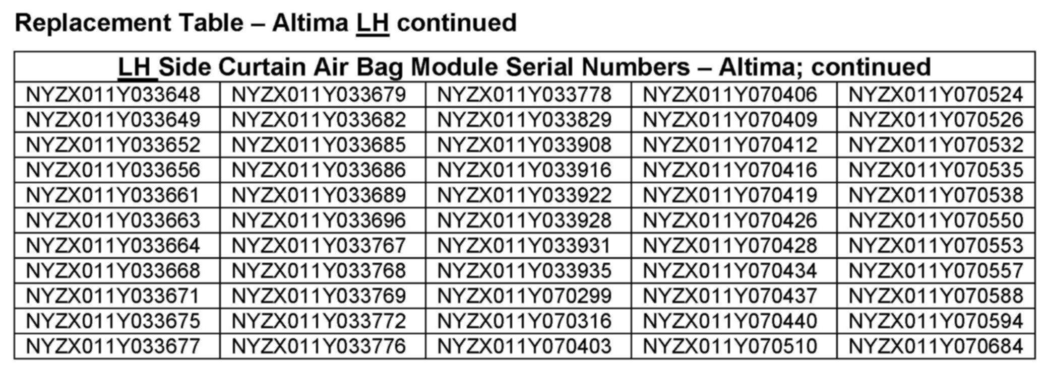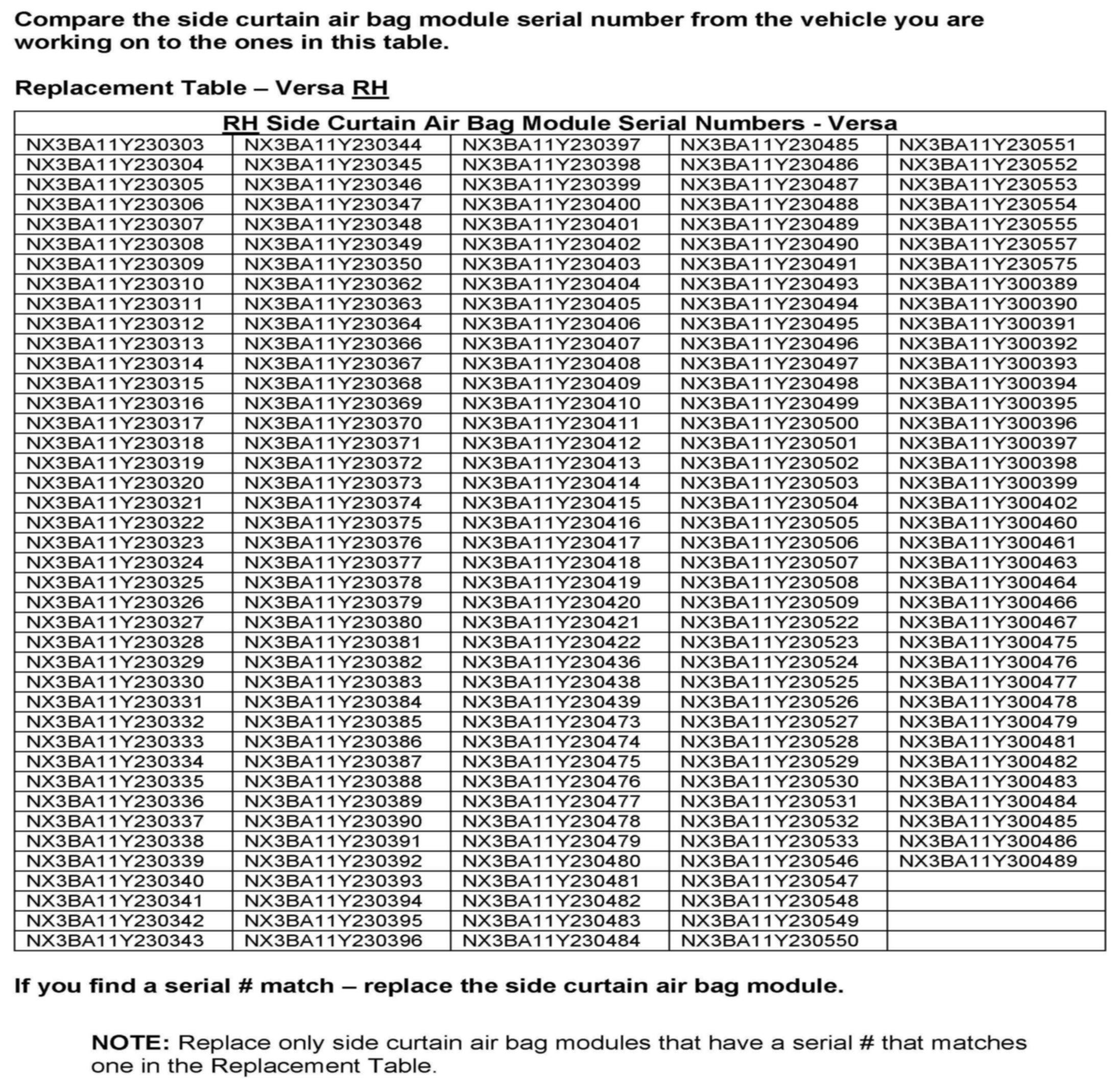 Compare the side curtain air bag module serial number from the vehicle you are working on to the ones in this table.