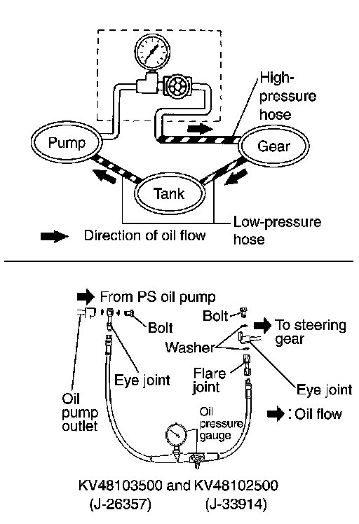 1.Connect the Tool between oil pump discharge connector and high-pressure hose. Bleed air from the hydraulic circuit while opening valve fully. Procedures.