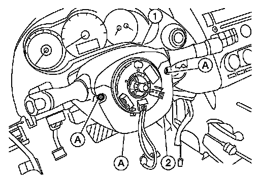 2.Remove the steering column cover screws (A), then remove the steering column upper (1) and lower (2) covers.