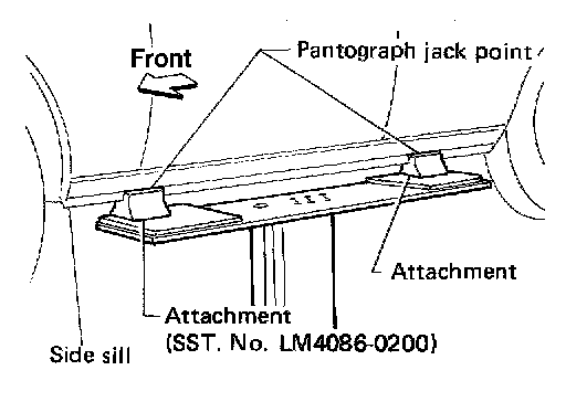 - The board-on lift attachment (LM4086-0200) set at front end of vehicle should be set on the front of the sill under the front door opening.
