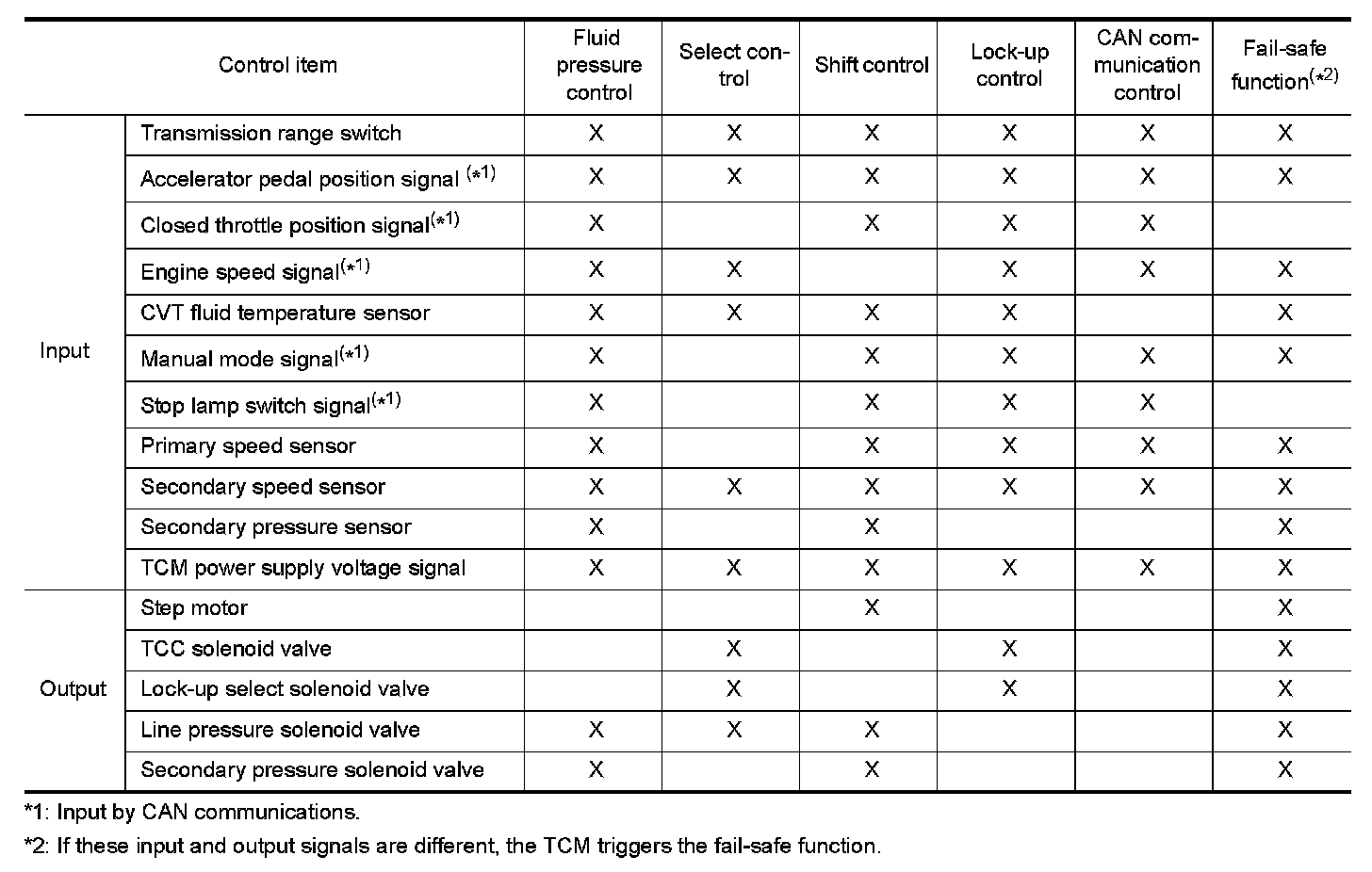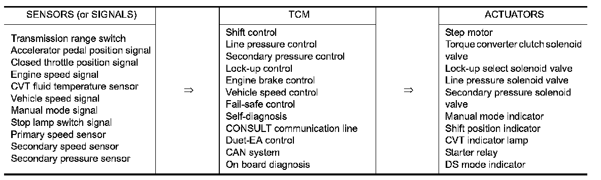 The CVT senses vehicle operating conditions through various sensors. It always controls the optimum shift position and reduces shifting and lock-up shocks.