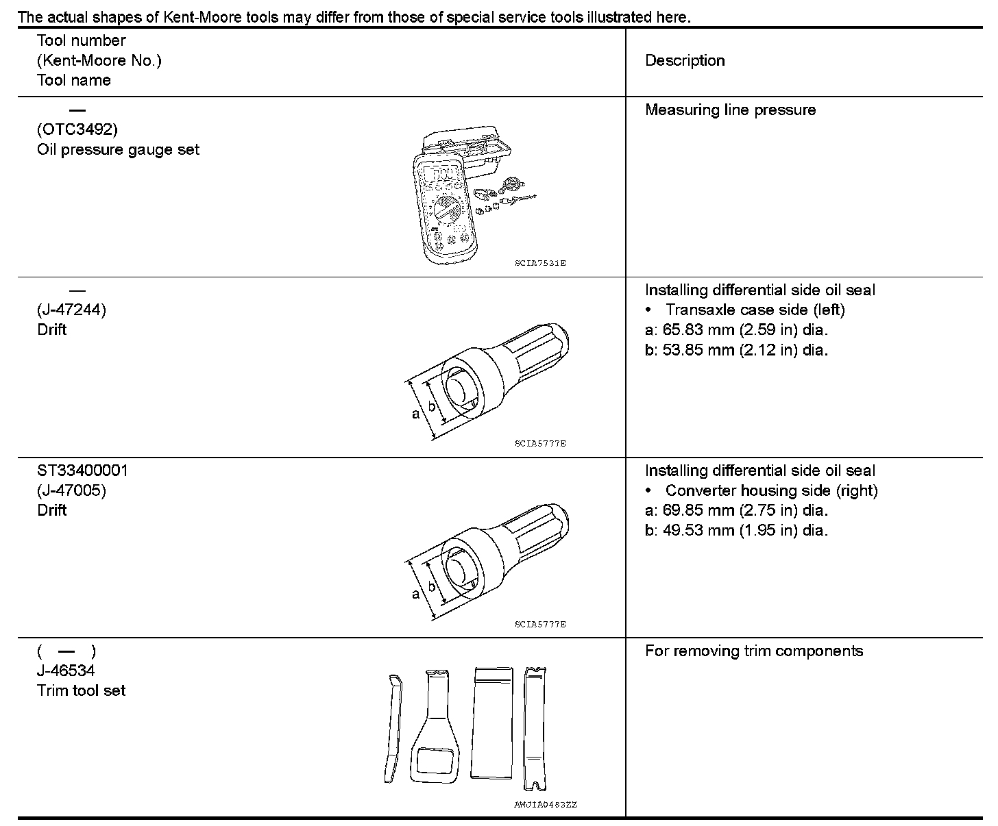 The actual shapes of Kent-Moore tools may differ from those of special service tools illustrated here.