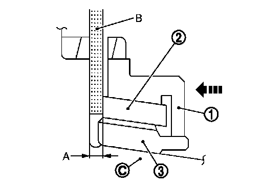 1.Measure the clearance (A) at two points or more diagonally opposite using a feeler gauge (B) when pressing outer Baulk ring (1), synchronizer cone (2), and inner Baulk ring (3) toward gear taper cone (C). Then calculate mean value.