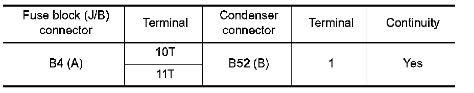 2.Check continuity between fuse block (J/B) connector (A) and condenser connector (B).