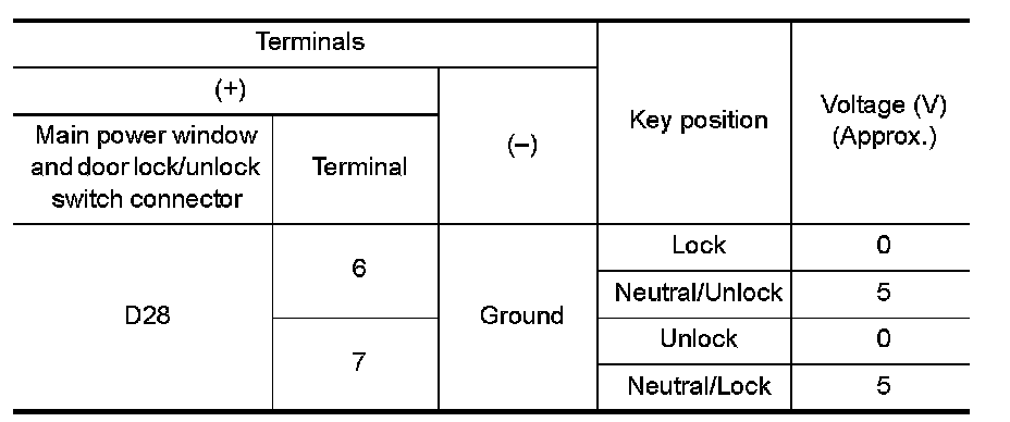 2.Check voltage between main power window and door lock/ unlock switch connector and ground.