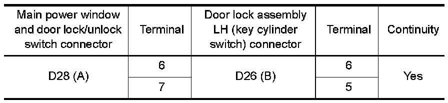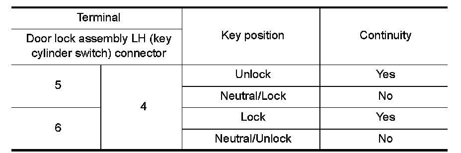 Check continuity between door lock assembly LH (key cylinder switch) connector and ground.