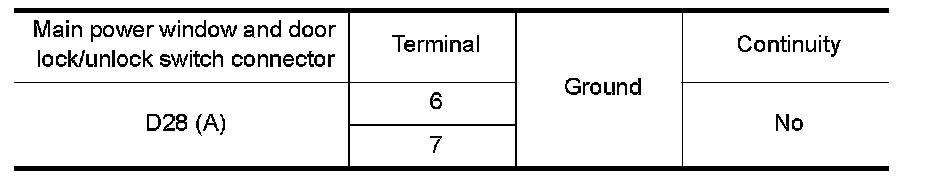 4.Check continuity between main power window and door lock/unlock switch connector (A) and ground.