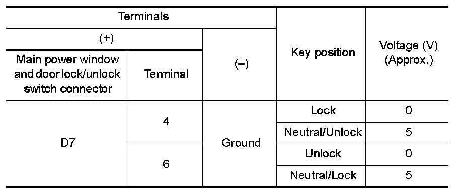 2.Check voltage between main power window and door lock/ unlock switch connector and ground.