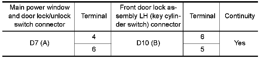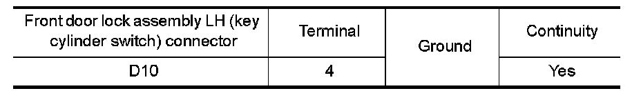 Check continuity between front door lock assembly LH (key cylinder switch) connector and ground.
