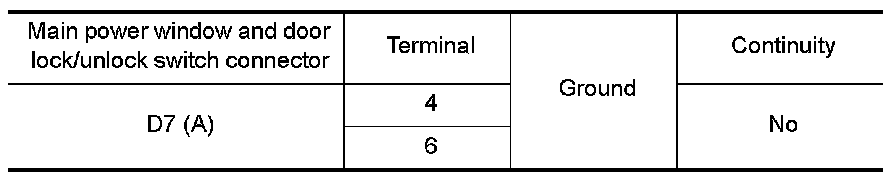 4.Check continuity between main power window and door lock/unlock switch connector (A) and ground.