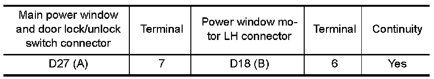 2.Check continuity between main power window and door lock/ unlock switch connector (A) and power window motor LH connector (B).