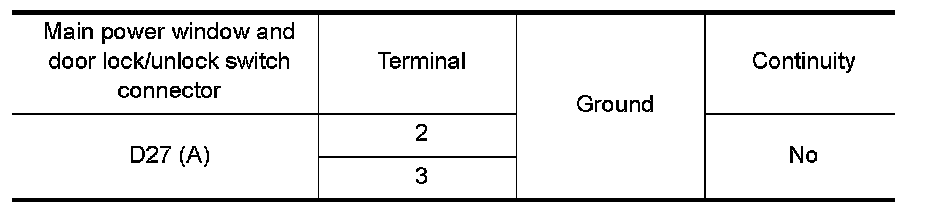 4.Check continuity between main power window and door lock/unlock switch connector (A) and ground.